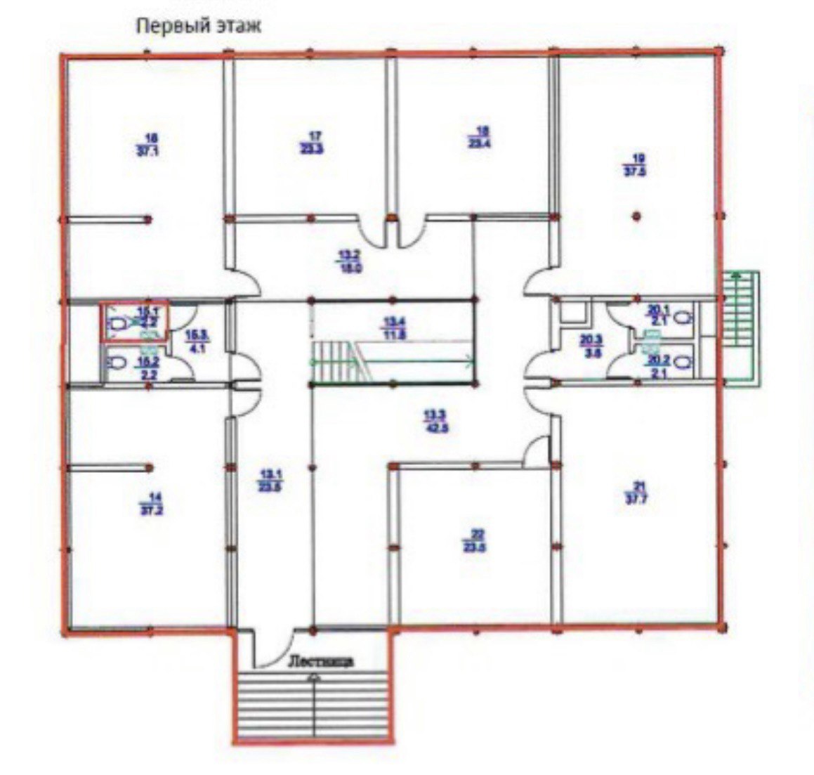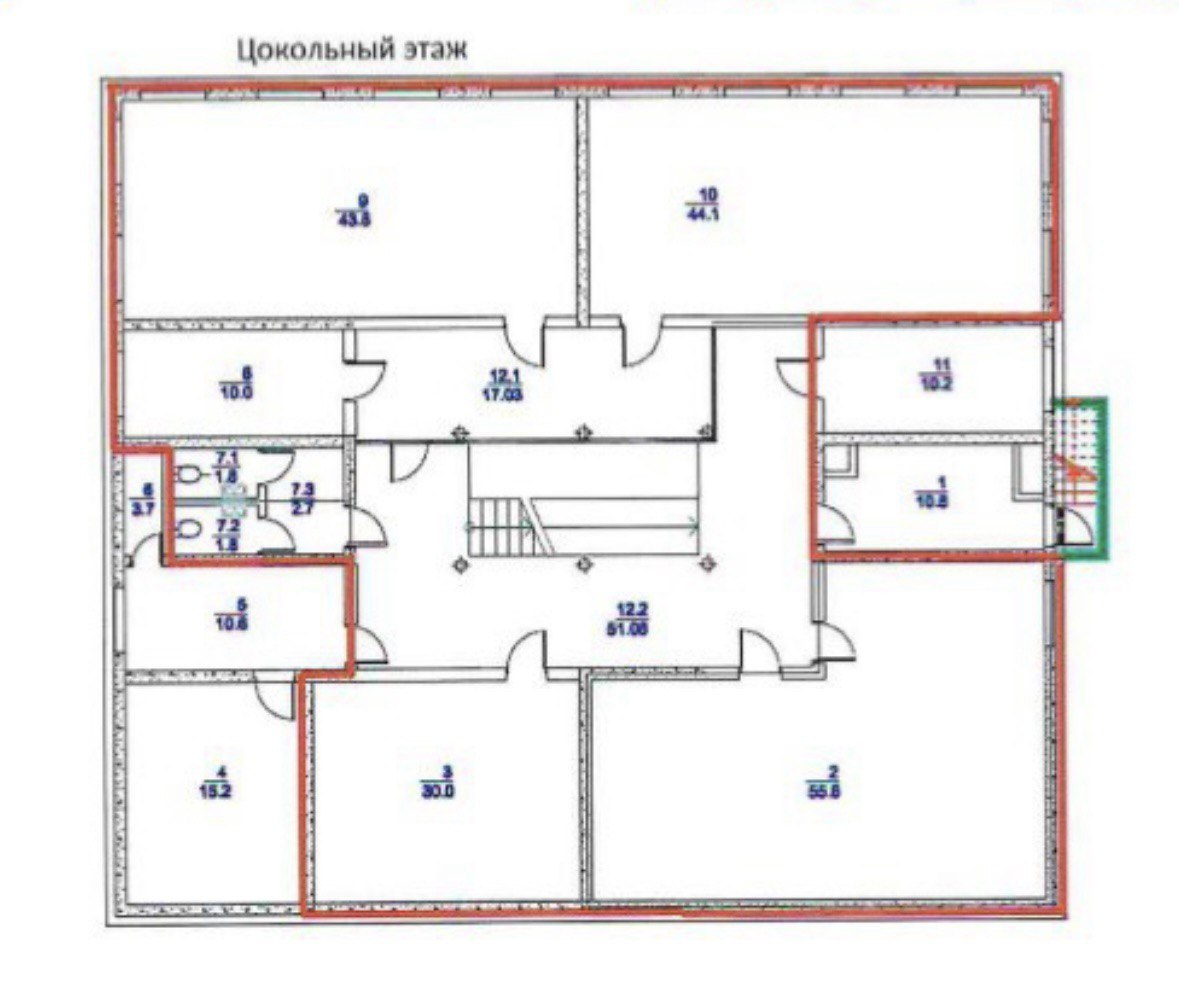 - Цокольный этаж с естественным светом: Здесь расположены технические и вспомогательные помещения, включая серверную с коммуникациями, комнату для приёма пищи, отдельные кабинеты и санузлы.